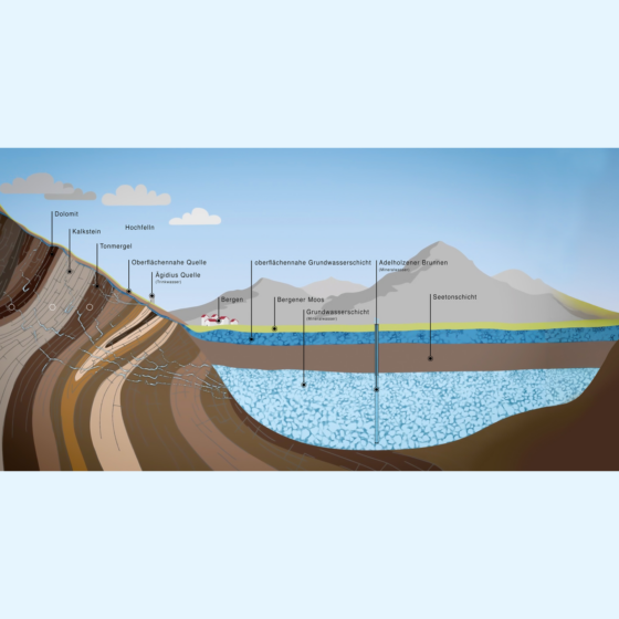 Im tieferen Grundwasser-Vorkommen unter dem Bergener Moos bildet sich seit jeher weit mehr Wasser, als wir für unser Mineralwasser und für die Trinkwasserversorgung der Gemeinde Bergen entnehmen. Dies bleibt auch für die Zukunft sichergestellt.